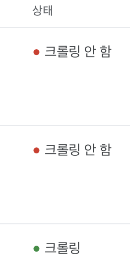제대로 하나하나 입력하고 로그인 추가를 누르면 방금 등록한 페이지가 빨간색으로 크롤링 안 함이라고 떠있는 것을 확인할 수 있다. 며칠 지나면 크롤링으로 바뀐다고 하니 기다려보자. 나의 경우 크롤링이라고 되어 있는 것은 예전에 같은 방법으로 시도했던 건데 언젠가 크롤링 됐나보다. 확인 안 해 봤었음 ㅎㅎ