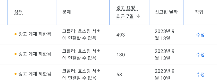 3개의 사이트 상태가 광고 게재 제한됨으로 바뀌었고 문제는 크롤러 : 호스팅 서버에 연결할 수 없음이라고 표시되어 있었다. 광고 요청 횟수를 보면 횟수가 굉장히 많은데 갑자기 많은 사람이 유입되면서 광고 요청이 자연히 많아진 것 같고 그 과정에서 문제가 생긴 게 아닐까 하는 추측을 해 보았다.
